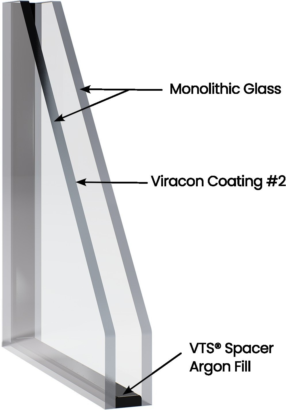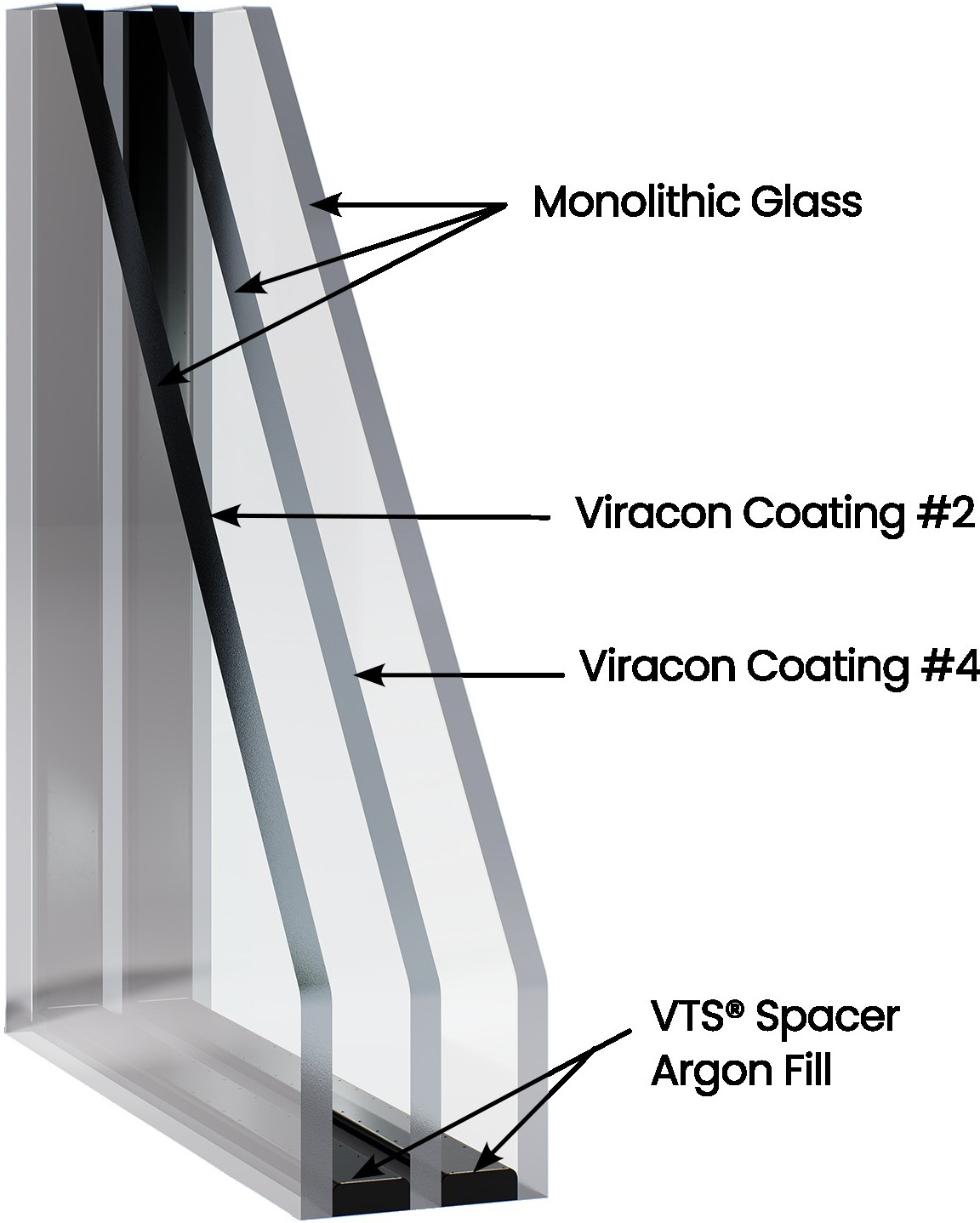 Viracon insulating glass consists of two or more plies of glass enclosed with a hermetically sealed spacer. Triple insulating glass units are constructed with three plies of glass separated by two hermetically sealed spacers.